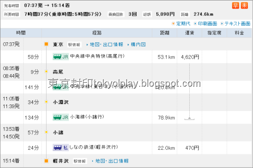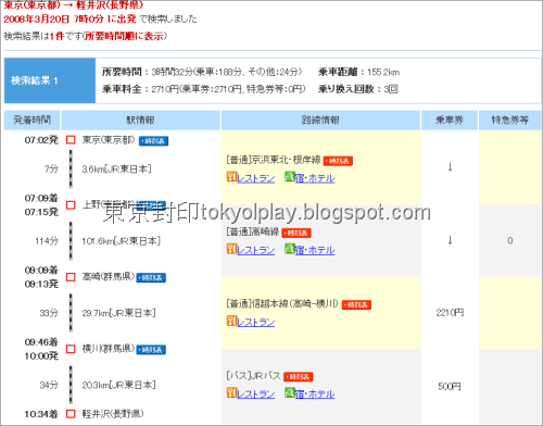譬如查東京到輕井澤的列車,因為搭長野新幹線會直接到輕井澤,但是搭普通列車信越本線只有到達橫川,要再搭巴士前往,可參考輕井澤(karuizawa)---日本避暑勝地,交通篇裡面的第二個方案,下面是用eki查的畫面
