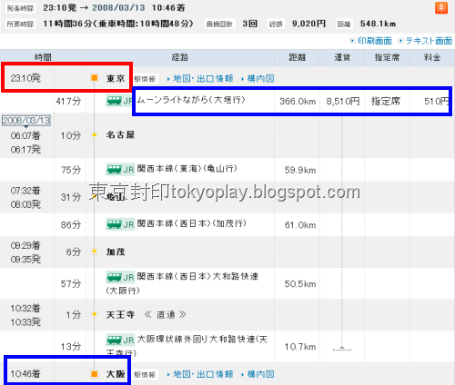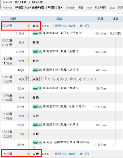 想搭車從東京到大阪,輸入出發及到著站,按下檢索,即可出現路線的選擇,譬如